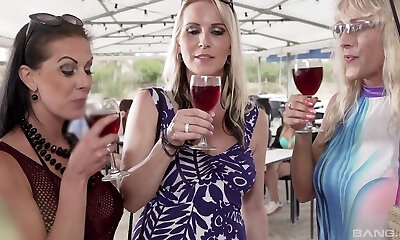 Blowjob by the pool and fucking on the sofa - Horny Milfs Three-way